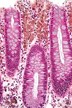 The most common cause of melanosis coli is the extended use of laxatives, and commonly anthraquinone containing laxatives such as senna, aloe vera, and other plant glycosides.[1] The anthranoid laxatives pass through the gastrointestinal tract unabsorbed until they reach the large intestine, where they are changed into their active forms. The resulting active compounds cause damage to the cells in the lining of the intestine and leads to apoptosis (a form of cell death). The damaged (apoptotic) cells appear as darkly pigmented bodies that may be taken up by scavenger cells known as macrophages. When enough cells have been damaged, the characteristic pigmentation of the bowel wall develops. The condition can develop after just a few months of laxative use.[2]