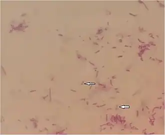 Melioidosis is caused by gram-negative, motile, saprophytic bacteria named Burkholderia pseudomallei.[14] The bacteria are usually opportunistic, facultative intracellular pathogens.[14] It is also aerobic and oxidase test positive.[2] A granule at the centre of the bacterium makes it resemble a "safety pin" when Gram stained.[2] The bacteria emit a strong soil smell after 24 to 48 hours of growth in culture, however smelling for the identification of the bacteria is not recommended for routine laboratory practice. One of the factors causing B. pseudomallei's resistance to various kinds of antibiotics is because it produces a glycocalyx polysaccharide capsule.[15] It is generally resistant to gentamicin and colistin but sensitive to co-amoxiclav. B. pseudomallei is a biosafety level 3 pathogen which requires specialized laboratory handling.[2] In humans and animals, another similar organism named Burkholderia mallei is the causative agent of the disease glanders.[1] B. pseudomallei can be differentiated from another closely related, but less pathogenic species B. thailandensis by its ability to assimilate arabinose.[10] B. pseudomallei is highly adaptable to various host environments ranging from inside mycorrhizal fungi spores to amoeba.[2] Its adaptability may give it a survival advantage in the human body.[1]