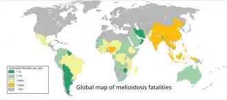 - ^ Limmathurotsakul D, Golding N, Dance DA, Messina JP, Pigott DM, Moyes CL, Rolim DB, Bertherat E, Day NP, Peacock SJ, Hay SI (11 January 2016). "Predicted global distribution of Burkholderia pseudomallei and burden of melioidosis". Nature Microbiology. 1 (1): 15008. Bibcode:2016NatMb...115008L. doi:10.1038/nmicrobiol.2015.8. PMC 4746747. PMID 26877885.