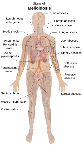 - ^ a b c d e f g h i j k l m n o p q r s t u v w x y z aa ab ac Gassiep I, Armstrong M, Norton R (March 2020). "Human Melioidosis". Clinical Microbiology Reviews. 33 (2). doi:10.1128/CMR.00006-19. PMC 7067580. PMID 32161067.