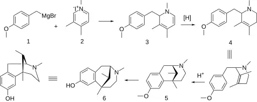 Reaction of the Grignard reagent from p-methoxybenzyl chloride (1) with the lutidine methiodide (2) affords the benzylated dihydropyridine (3). Reduction of the enamine π-bond leads to the tetrahydropyridine (4). Cyclization by means of acid leads directly to the benzomorphan ring system (5). Demethylation of the aromatic ring system gives the phenol. Although this last compound is in fact a relatively potent analgesic, it is not available commercially as a drug.[9][10] Also see:[11]
