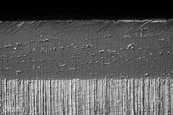 These extremely thin cuts are important for use with transmission electron microscope (TEM) and serial block-face scanning electron microscopy (SBFSEM), and are sometimes also important for light-optical microscopy.[19] The typical thickness of these cuts is between 40 and 100 nm for transmission electron microscopy and often between 30 and 50 nm for SBFSEM. Thicker sections up to 500 nm thick are also taken for specialized TEM applications or for light-microscopy survey sections to select an area for the final thin sections. Diamond knives (preferably) and glass knives are used with ultramicrotomes. To collect the sections, they are floated on top of a liquid as they are cut and are carefully picked up onto grids suitable for TEM specimen viewing. The thickness of the section can be estimated by the thin-film interference colors of reflected light that are seen as a result of the extremely low sample thickness.[20]