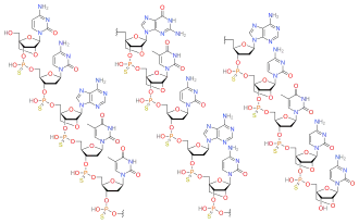 Miravirsen is a modified oligonucleotide consisting of a chain of 15 nucleotides, the base sequence of which is designed to selectively bind to miR-122.[1][2] Seven of the 15 sugar units are deoxyriboses, and the other eight are riboses with an additional bridge between the 2' oxygen and the 4' carbon atoms; this makes the molecule a locked nucleic acid. Furthermore, the phosphate units have been replaced by thiophosphates.[2]