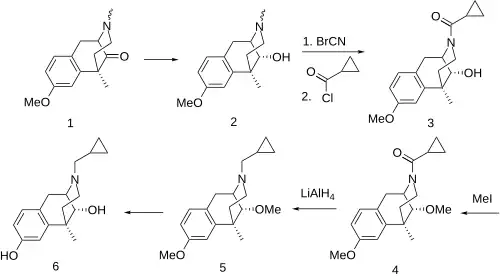 Reduction of the carbonyl group in oxygenated benzomorphan 1 affords the corresponding alcohol (2). This intermediate is then N-demethylated by means of BrCN. Acylation with cyclopropylcarbonyl chloride[6][7] gives the amide (3). The alcohol is then converted to the ether by treatment with MeI and base (4). Treatment with LiAlH4 serves to reduce the amide function. Cleavage of the phenolic ether by one of the standard schemes affords moxazocine (6).