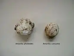A majority of these cases are due to mistaken identity.[17] This is a common occurrence with A. phalloides in particular, due to its resemblance to the Asian paddy-straw mushroom, Volvariella volvacea. Both are light-colored and covered with a universal veil when young.