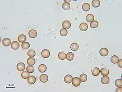 The spores of Myxogastria are haploid, mainly round and measure between 5 μm and 20 μm, rarely up to 24 μm in diameter. Their surface is generally reticular, sharp, warty or spiky and very rarely smooth. The typical colour of the spore mass becomes visible through the structure, since the spores themselves are not pigmented. In some species, especially of the genus Badhamia, the spores produce lumps. The colour, shape and diameter of spores are important characteristics for identifying species.[11]