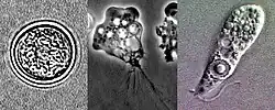 To endure harsh environmental conditions, trophozoites transform into microbial cysts,[17] spherical, single-layered structures about 7–15 μm in diameter, enclosing a single cell nucleus.[18] Acting as a resilient capsule, the cyst enables the amoeba to withstand adverse circumstances. Factors triggering cyst formation include food scarcity, overcrowding, desiccation, waste accumulation, and cold temperatures. When conditions improve, the amoeba can emerge through the pore or ostiole at the center of the cyst. N. fowleri has been observed to encyst at temperatures below 10 °C (50 °F).[18][17]