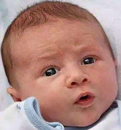 | An infant with neonatal acne on the face, especially the forehead | |