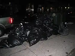 DSNY provides curbside pickup of trash and recycling multiple times per week for every residential building in the city. Trash must be placed in black bags and recycling in clear or blue bags. This leads to complaints about the sidewalk space taken up by trash, especially as large residential buildings produce 'trash bag mountains' daily.[4] Some buildings do place their garbage in special containers.[5]