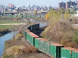 A train of green municipal solid waste containers on the Oak Point Link in the Bronx