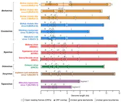 Nyamiviridae is a family of negative-strand RNA viruses in the order Mononegavirales.[1] Ecdysozoa and birds serve as natural hosts.[2] The name is a portmanteau of Nyamanini Pan (place of isolation of type species Nyamanini virus in South Africa) and Midway Atoll (place of isolation of Midway virus in the United States) and the suffix -viridae used to denote a virus family. There are seven genera in this family.[3][4]