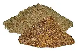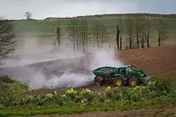 Chicken litter, which consists of chicken manure and bedding, is an organic fertilizer that has been proposed to be superior for conditioning soil for harvest to synthetic fertilizers.[14] It contains similar minerals to other manures, while also having trace amounts of copper, zinc, magnesium, boron, and chloride.[13] Depending on the type of chicken litter obtained, it may contain bird remains. This type of chicken litter should not be spread on crops, and can pose a risk to grazing livestock due to botulism, a disease caused by bacteria within decaying birds.[13]