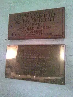 Plaque commemorating first meeting of Oxfam in the Old Library, the University Church, Oxford