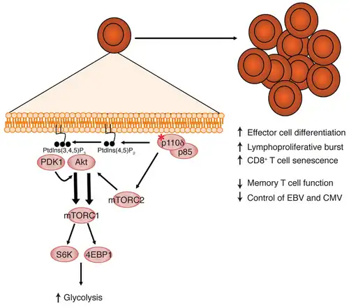1. ^ a b c d e f g h i j k Lucas CL, Kuehn HS, Zhao F, Niemela JE, Deenick EK, Palendira U, Avery DT, Moens L, Cannons JL, Biancalana M, Stoddard J, Ouyang W, Frucht DM, Rao VK, Atkinson TP, Agharahimi A, Hussey AA, Folio LR, Olivier KN, Fleisher TA, Pittaluga S, Holland SM, Cohen JI, Oliveira JB, Tangye SG, Schwartzberg PL, Lenardo MJ, Uzel G (2014). "Dominant-activating germline mutations in the gene encoding the PI(3)K catalytic subunit p110δ result in T cell senescence and human immunodeficiency". Nature Immunology. 15 (1): 88–97. doi:10.1038/ni.2771. PMC 4209962. PMID 24165795.