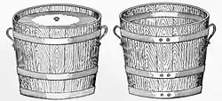 Some pails were supplied with deodorants such as iron sulphate. Manchester Corporation attempted to remove the smell of putrefaction by attaching cinder-sifters to their closets so that fine ash could be poured on top of the excrement.[16] The Goux system, invented in the 1860s by Pierre Nicholas Goux, a landowner near Paris, and widely used in France, overcame some of the more common problems associated with pail closets by lining the pail with an absorbent material.[1] The Rochdale Corporation experimented with Goux's design for several months but settled instead on a system which used smaller pails. Goux's system did, however, find a home in Halifax, where it was used in more than 3,000 closets after 1870. The wooden pails used in Halifax were oval in cross-section (about 24 by 19 inches) and 16 inches deep. Each was lined at the sides and bottom with a mixture of refuse, such as straw, grass, street sweepings, wool, hair, and even seaweed. This lining, which was formed by a special mould and to which sulphate of lime was added, was designed to help remove the smell of urine, slow putrefaction and keep the excreta dry. Pails were collected between 7 am and 5:30 pm. Members of the public occasionally complained about the smell, which usually occurred when a pail was left to overflow, such as in winter 1875 when severe weather conditions prevented the horse-pulled collection wagons from reaching the closets.[17]