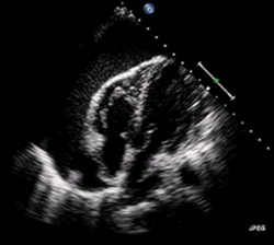 A 2D echo transthoracic echocardiogram of pericardial effusion. The "swinging" heart.
