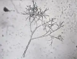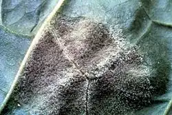 Peronospora hyoscyami f.sp. tabacina is a plant pathogen infecting tobacco that causes blue mold. It is an oomycete (a fungus-like organism) that is highly destructive toward seed plants. It is very prevalent in humid farming zones, like the southeastern and Eastern U.S., Canada, and countries bordering the Caribbean. The disease was first identified in 1921 in Florida and Georgia.[1] Ten years later the same disease was found once again in the same region of the U.S. The disease began to spread into Virginia, Maryland, and North Carolina. A few years later, the disease reached Kentucky and Tennessee. In 1960, a blue mold epidemic spread in approximately eleven countries. There was approximately twenty five million dollars in losses which is nearly thirty percent of tobacco plants at the time.[1] Each year, Peronospora hyoscyami is introduced as blue mold as windblown spores from outside the region by infected transplants.