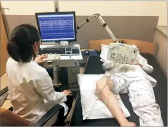 Rehabilitation physician conducting a 10-channel dynamic polyelectromyography during a patient's dystonic event