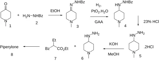Hydrazone formation of 1-methyl-4-piperidone (1) with benzohydrazide (2) gives (3). Catalytic hydrogenation using Adams' catalyst gives the substituted hydrazine (6) after acid-catalyzed hydrolysis to remove the benzoyl group and neutralization. The pyrazolone ring is formed in a condensation reaction with ethyl 2-benzoylbutanoate (7), yielding piperylone.[2][3][4]