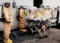 In healthcare, a product known as the Racal suit can be used, consisting of a plastic suit and a PAPR fitted with HEPA filters. They were used by the U.S. Army Aeromedical Isolation Team to perform medical evacuations of patients with highly infectious diseases.[12][13]