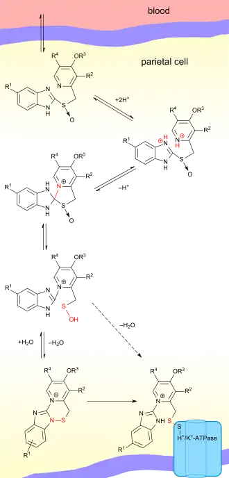 - ^ Fellenius E, Berglindh T, Sachs G, Olbe L, Elander B, Sjöstrand SE, et al. (March 1981). "Substituted benzimidazoles inhibit gastric acid secretion by blocking (H+ + K+) ATPase". Nature. 290 (5802): 159–161. Bibcode:1981Natur.290..159F. doi:10.1038/290159a0. ISSN 0028-0836. PMID 6259537. S2CID 4368190.