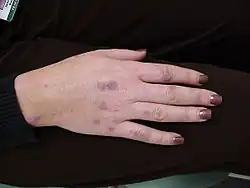 Healing blisters on the hand of a woman using naproxen and tanning booth