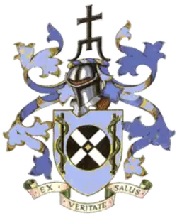 Escutcheon: The crossed bands and central square within a circle is a reference to "an intellect that has become disordered and has turned its strength against itself and the body". The two Rod of Asclepius (a serpent wrapped around a staff) are an ancient Greek symbol of healing and medicine, but are also a reference to Carl Jung's theory of the wounded healer, and the serpent is also a reference to Ungud, the serpent of the Australian Aboriginal dreamtime.[5] Crest: The Alchemical symbol for Alum was attributed special mental healing powers, and above this symbol is a Roman Cross. The combination of the two symbols was made as an allusion to the "exerting healing influence over the disordered intellect".[5] Motto: In 1966–68, the college considered several motto suggestions, including Humanitate Progedi (‘Progress through Understanding’), but all were rejected by the College of Arms as not being good Latin. A suggestion from Dr John Cade – Non est viveresed valere vita (‘Not just to live but to value life’) – was agreed but later rejected after it was found to be the motto of the Royal Society of Medicine. The final suggestion of Ex Veritate Salus by Dr Donald Scott-Orr was adopted by the college council in October 1968.[5]