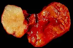 Benign tumour of the submandibular gland, also known as pleomorphic adenoma, presented as a painless neck mass in a 40-year-old man. At the left of the image is the white tumour with its characteristic cartilaginous cut surface. To the right is the normally lobated submandibular salivary gland.Warthin's tumor
