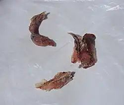 Typical flexible splints that may be used in septoplasty. They are held in place in the nose with a stitch through the hole, and are typically removed seven to 10 days after surgery.