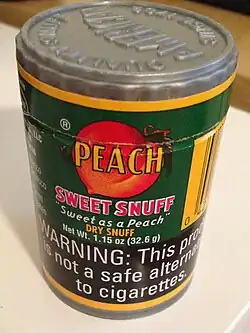 Container of Peach dry snuff, made in the United States