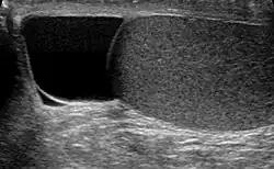 | Ultrasound of a testicle (grey) and a spermatocele (black). | |