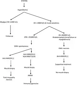 7. ^ a b c Hamann, PD; Cooper, RG; McHugh, NJ; Chinoy, H (October 2013). "Statin-induced necrotizing myositis - a discrete autoimmune entity within the "statin-induced myopathy spectrum"". Autoimmunity Reviews (Review). 12 (12): 1177–71. doi:10.1016/j.autrev.2013.07.001. PMC 4589155. PMID 23851103.