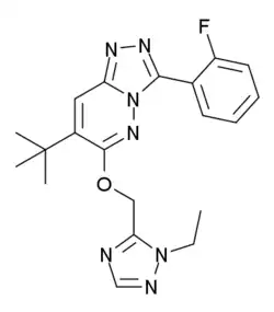 - ^ Carling RW, Madin A, Guiblin A, Russell MG, Moore KW, Mitchinson A, et al. (November 2005). "7-(1,1-Dimethylethyl)-6-(2-ethyl-2H-1,2,4-triazol-3-ylmethoxy)-3-(2-fluorophenyl)-1,2,4-triazolo[4,3-b]pyridazine: a functionally selective gamma-aminobutyric acid(A) (GABA(A)) alpha2/alpha3-subtype selective agonist that exhibits potent anxiolytic activity but is not sedating in animal models". Journal of Medicinal Chemistry. 48 (23): 7089–92. doi:10.1021/jm058034a. PMID 16279764.