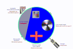 The machine had three modes of operation, with a turntable moving some apparatus into position for each of those modes: either a light, some scan magnets, or a tungsten target and flattener.[10]