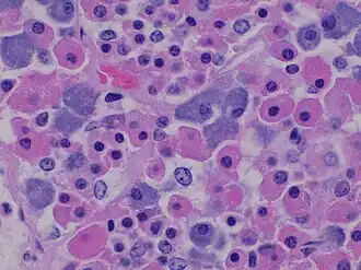 H&E staining of a biopsied thyrotroph adenoma. Basophilic cells (thyrotropes) appear spindle-shaped.