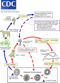 - ^ a b c d e f g h i j k l m "Guidelines for Veterinarians: Prevention of Zoonotic Transmission of Ascarids and Hookworms of Dogs and Cats". Division of Parasitic diseases. Centers for Disease Control and Prevention. 2004. Archived from the original on 21 August 2010. Retrieved 17 September 2017.