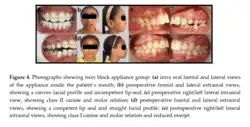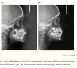 - ^ a b c O’Brien, Kevin; Wright, Jean; Conboy, Frances; Sanjie, YeWeng; Mandall, Nicky; Chadwick, Stephen; Connolly, Ivan; Cook, Paul; Birnie, David; Hammond, Mark; Harradine, Nigel; Lewis, David; McDade, Cathy; Mitchell, Laura; Murray, Alison (September 2003). "Effectiveness of early orthodontic treatment with the twin-block appliance: A multicenter, randomized, controlled trial. Part 1: Dental and skeletal effects". American Journal of Orthodontics and Dentofacial Orthopedics. 124 (3): 234–243. doi:10.1016/s0889-5406(03)00352-4. ISSN 0889-5406. PMID 12970656.