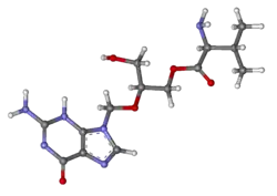 Valganciclovir is a prodrug for ganciclovir, which is a synthetic analog of 2′-deoxy-guanosine. Its structure is the same as ganciclovir, except for the addition of a L-valyl ester at the 5' end of the incomplete deoxyribose ring. The valine increases both the absorption of the drug in the intestines, as well as the bioavailability of the drug once it is absorbed. The L-valyl ester is cleaved by esterases in the intestines and the liver, leaving ganciclovir to be absorbed by the virus-infected cells.[8]