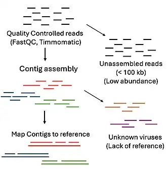 The output of virome metagenomic studies using shotgun sequencing is hundreds of thousands or even millions of short reads (~100 - 300 bp). These reads undergo quality control checkpoints using tools to assess sequence read quality, read trimming and host depletion to prepare the viral sequences for assembly and alignment.[3] Reference-guided de novo assembly is the most popular method for genome assembly in virome analysis.[13] Sequencing reads are assembled into overlapping subsequences of a fixed length k (k-mers) known as contigs.[13][14] Contigs are aligned to reference databases for sequence similarity to assign viral taxonomy of the sample.[3] This method, however, requires prior knowledge of viral taxonomy and is greatly impacted by the lack of robust references available.[15] Current databases tend to be biased towards clinically relevant and cultivable viruses, notably reducing the analysis power.[15] As a result, it is believed that our understanding of virus classification and taxonomy greatly underestimates the virome's true diversity.[15]