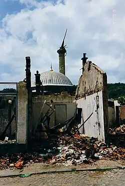 Numerous Albanian cultural sites in Kosovo were destroyed during the Kosovo conflict (1998–1999) which constituted a war crime violating the Hague and Geneva Conventions.[48] Religious objects were also damaged or destroyed. Of the 498 mosques in Kosovo that were in active use, the International Criminal Tribunal for the former Yugoslavia (ICTY) documented that 225 mosques sustained damage or destruction by the Yugoslav Serb army.[49] In all, eighteen months of the Yugoslav Serb counterinsurgency campaign between 1998 and 1999 within Kosovo resulted in 225 or a third out of a total of 600 mosques being damaged, vandalised, or destroyed alongside other Islamic architecture during the conflict.[50][51][49] Other Islamic monuments were also targeted, two Sufi shrines/lodges dating from the 15-18th century were destroyed, A 15th century hamam and all nine quran reading schools were also destroyed.[52] Additionally 500 Albanian owned kulla dwellings (traditional stone tower houses) and three out of four well preserved Ottoman period urban centres located in Kosovo cities were badly damaged resulting in great loss of traditional architecture.[53][50] Kosovo's public libraries, in particular 65 out of 183 were completely destroyed with a loss of 900,588 volumes, while Islamic libraries sustained damage or destruction resulting in the loss of rare books, manuscripts and other collections of literature.[54][55] Archives belonging to the Islamic Community of Kosovo with records spanning 500 years were also destroyed.[54][55] During the war, Islamic architectural heritage posed for Yugoslav Serb paramilitary and military forces as Albanian patrimony with destruction of non-Serbian architectural heritage being a methodical and planned component of ethnic cleansing in Kosovo.[50][56]