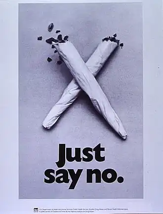 ![]() A U.S. government PSA from the Alcohol, Drug Abuse, and Mental Health Administration with a photo image of two marijuana cigarettes and a "Just Say No" slogan | |||||||