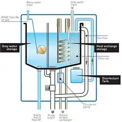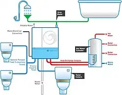 When recycling water from a bath (100–150 litres) or shower (50–80 litres) the waste water temperature is circa 20–25 °C. An in-house greywater recycling tank holds 150–175 litres allowing for the majority of waste water to be stored. Utilizing a built in copper heat exchange with circulation pump the residual heat is recovered and transferred to the cold feed of a combi-boiler or hot-water cylinder, reducing the energy used by the existing central heating system to heat water.