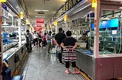 As of 2018, wet markets remain the most prevalent food outlet in urban regions of China despite the rise of supermarket chains since the 1990s.[4] In 2016, a Meat & Livestock Australia study of imported meat consumers in 15 Chinese cities found that 39% of those consumers had purchased beef from a wet market in the preceding month, while the same proportion who had purchased beef from a supermarket in the preceding month.[5] However, wet markets have been losing ground in popularity compared to supermarkets, despite the fact they may be seen as healthier and more sustainable.[6] Reports suggest "although there are well-managed, hygienic wet markets in and near bigger cities [in China], hygiene can be spotty, especially in smaller communities."[7] During the 2010s, "smart markets" equipped with e-payment terminals emerged as traditional wet markets faced increasing competition from discount stores.[3] Wet markets also began facing competition from online grocery stores, such as Alibaba's Hema stores.[8]