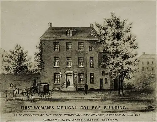 The Feminist Movement during the early to mid-19th century generated support for the Female Medical College of Pennsylvania. The Society of Friends in Philadelphia, a large group of Quakers, supported the women's rights movements and the development of the Female MCP.[6] MCP was initially located in the rear of 229 Arch Street in Philadelphia; it was changed to 627 Arch Street when Philadelphia renumbered streets in 1858.[7] In July 1861, the board of corroborators of the Female Medical College of Pennsylvania chose to rent rooms for the college from the Woman's Hospital of Philadelphia on North College Avenue.[8]