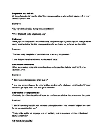 • The key to a genuine compliment is looking for something good in her and sharing it freely without expectation of getting anything back. For example, you might say, “Your smile is beautiful” or “That outfit looks great on you.”[3]