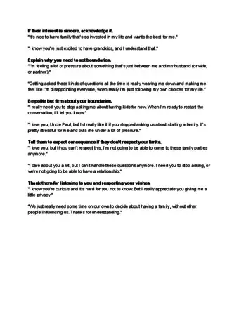 - For example, you might say, "I appreciate that you want to know when we'll have new babies in the family. However, that's a personal matter between me and my partner, and frankly, the question makes me a little uncomfortable."