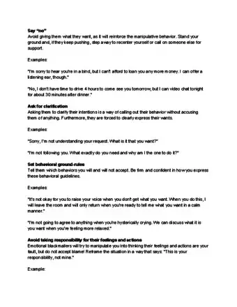 • For instance, they might use statements like “you never do what I want,” “you don’t care about my feelings,” or “my friends agree that you’re neglectful.” If you know these statements aren't true, don't let the person make you feel guilty.