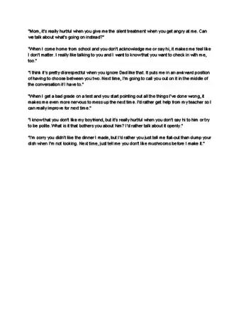 • For instance, you might say, “I feel neglected and ignored when you act like I'm not in the house. I'd like us to discuss problems head-on instead of just ignoring one another.”