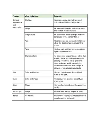 - Start with the basics, such as height, build, hair color, and eye color. Then, determine other physical details, such as how they stand or what unique features they have. Next, consider how their background, interests, and lifestyle impact their description.[1]