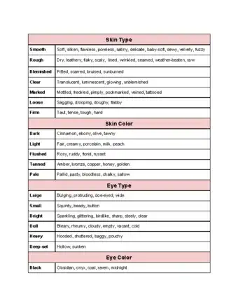 - ↑ https://www.carvezine.com/from-the-editor/10-tips-for-writing-physical-descriptions-of-your-characters.html